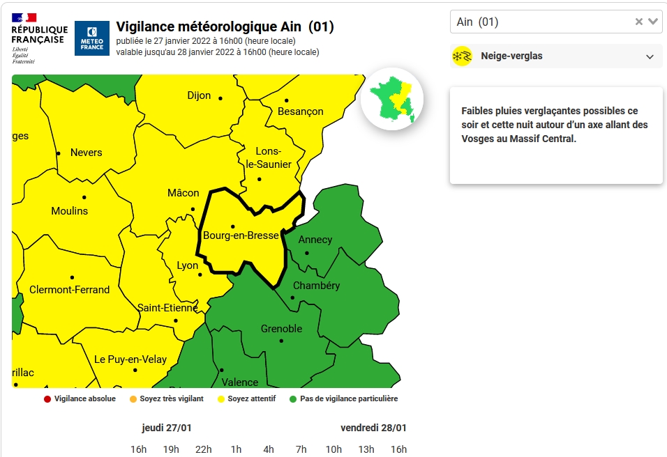 Attention, deux phénomènes dangereux sont attendus. Il faudra d’abord composer avec des brouillards givrants en soirée, en plaine jusqu’au bassin Belleysan. Et avant l’aube, un épisode de pluies verglaçantes est attendu sur les plaines de l’Ouest du département. Soyez prudents dans vos déplacements.